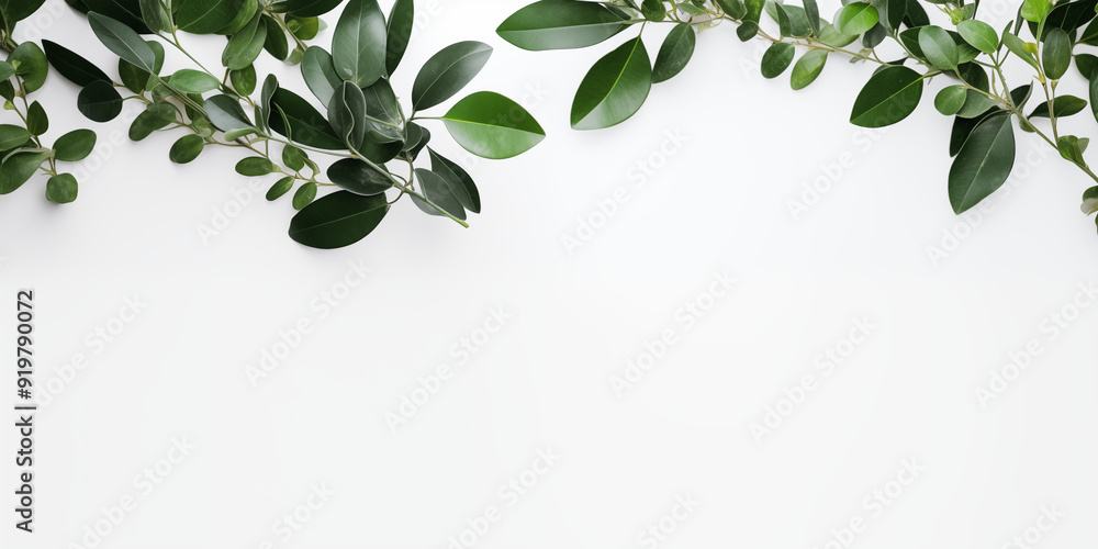 Obrazy Liście - Białe gładkie tło pod baner, grafikę z napisami. Zielone rośliny, gałązki i liście kwiatów. Widok... #919790072