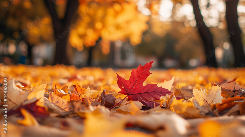 Obrazy Liście - Kolorowe liście w odcieniach żółci, czerwieni i pomarańczu tworzą malowniczy obraz w jesiennym... #944468093