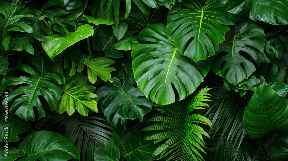Obrazy Liście - Wspaniałe, zielone liście i roślinność tropikalnej dżungli oferują intensywny widok na bujną florę. #956709484