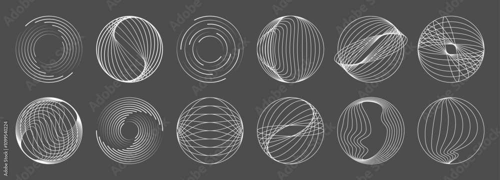 Geometria - Line round spiral shapes, concentric geometric wave swirl. Vector set of abstract vortex circles,... #1099540224