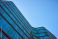 • Low angle view of modern curved high rise building. Glass facade of skyscraper. Office building against blue sky. Contemporary architectural design