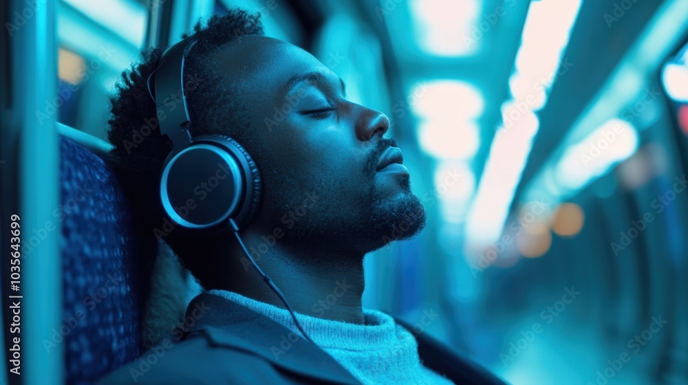 • Black man with headphones sitting in the subway, relaxed and listening to music, with soft blue light reflecting from the windows, background in blurred zone