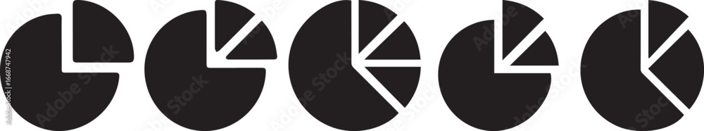 • Set of black pie chart icons with different segment divisions, simple circular infographic symbols for business, finance, statistics, report data visualization, and analytics design