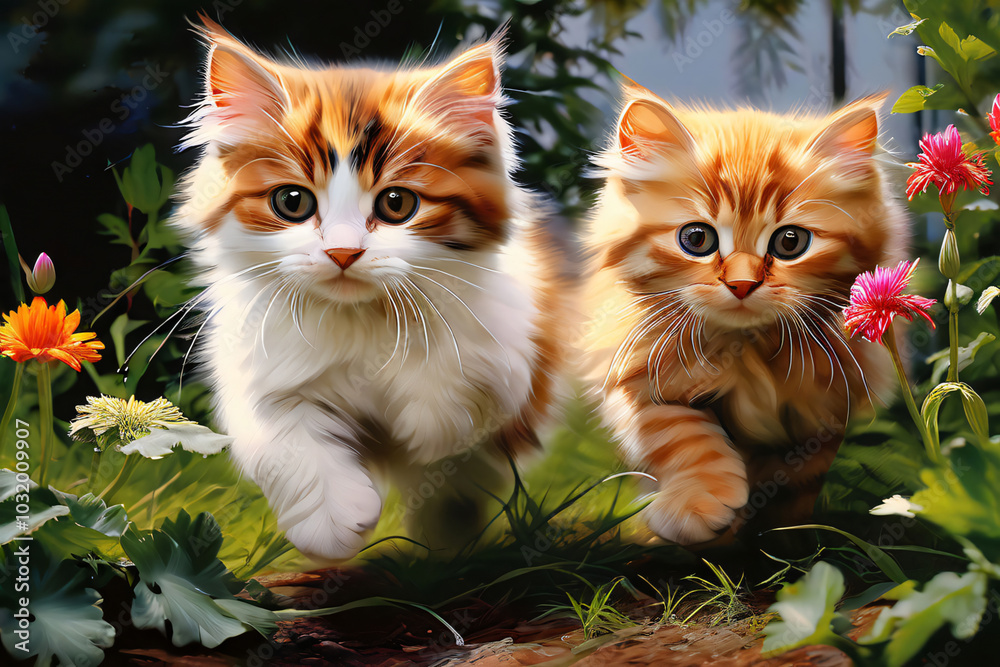 Fototapeta Koty - Niedliche Katzen spielen im Garten Nahaufnahme #1032009907