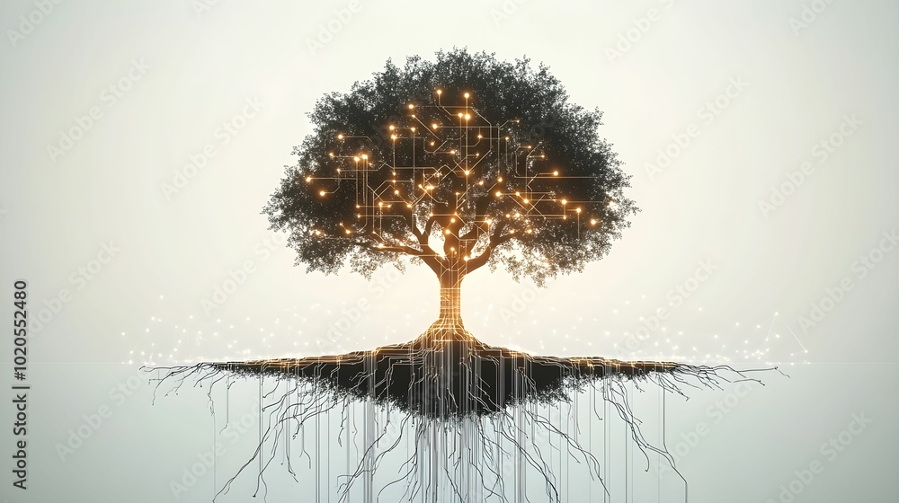 • minimalistyczna, drzewo, obwody, technologia, symbolika, cyfrowa przyszłość, rozwój, połączenia, korzenie, kable danych, wzrost, technologiczne gałęzie, organiczne, cyfrowe, innowacje, prostota, abstr