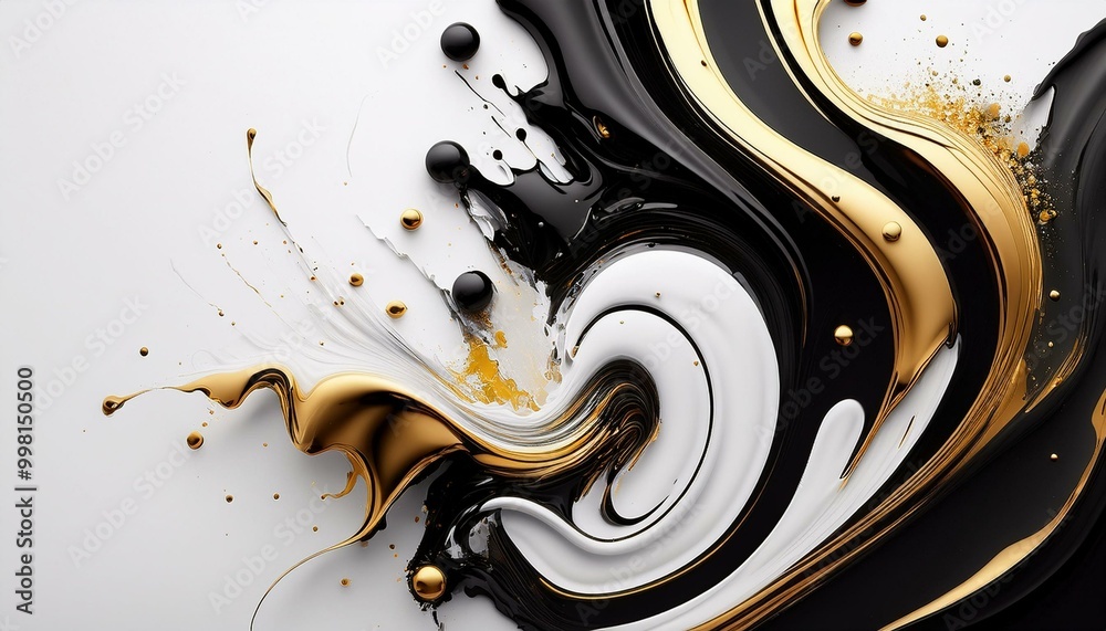 • Abstrakcyjne białe tło z płynną, rozlewającą się czarną, białą i złotą farbą