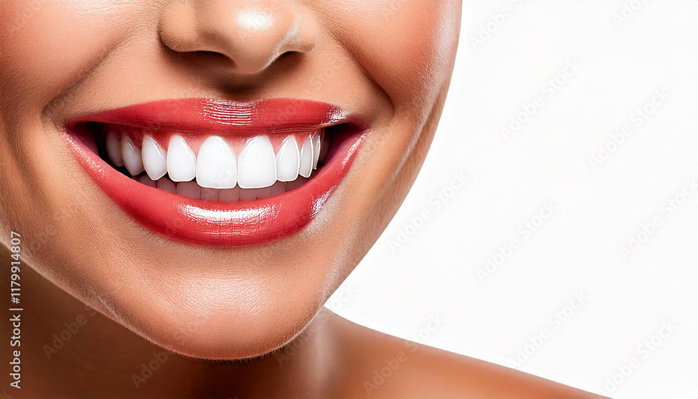 Obraz do Dentysty - Zbliżenie, białe piękne zęby, białe tło. Generative AI #1179914807