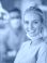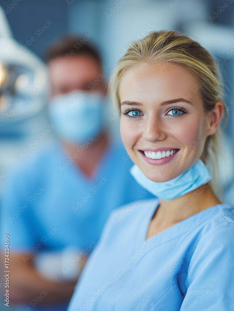 • Portret uśmiechniętej lekarki w gabinecie stomatologicznym. Kobieta ma na sobie błękitny strój medyczny i odsłoniętą maskę. W tle widać mężczyznę.