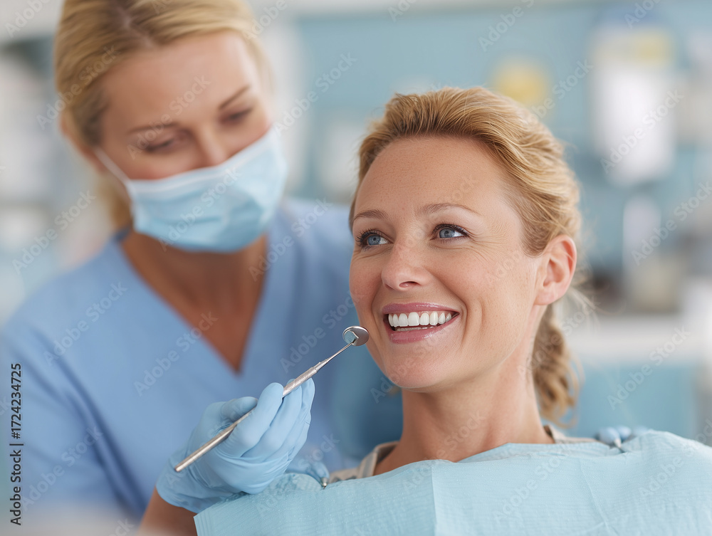 Obraz do Dentysty - Zadowolona pacjentka uśmiecha się na fotelu dentystycznym podczas badania. W tle dentystka w... #1724234725