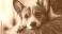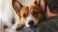 • Cute corgi dog looking to the camera while being held by his owner at the vet clinic, selective focus, copy space.