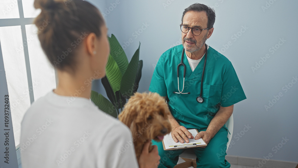 Obraz do Gabinetu Weterynaryjnego - A veterinarian in scrubs consults with a woman holding a poodle in a clinic room interior,... #1093732403