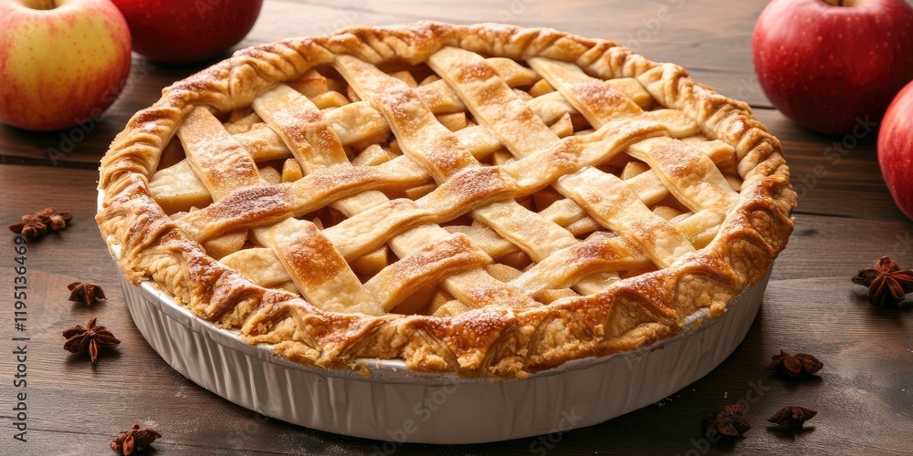 • Freshly baked apple pie with a golden lattice crust, surrounded by ripe red apples on a rustic wooden table, creating a cozy autumn atmosphere.