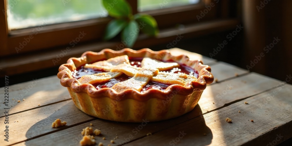 • A rustic, sunlit berry pie with a lattice crust sits on a weathered wooden table near a window