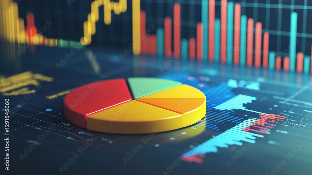 • Colorful pie chart on financial data screen, conveying market analysis and strategic planning. Ideal for finance, investments, and data visualization concepts.