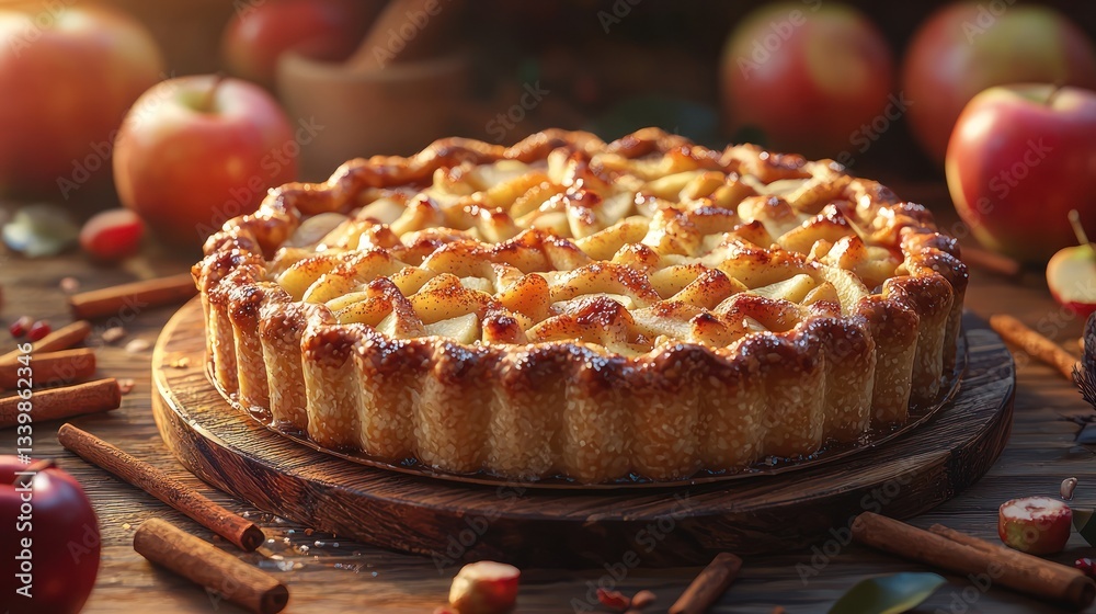 • Autumn apple pie on wooden board, with apples and cinnamon, sunny day background. Use Baking, food, dessert