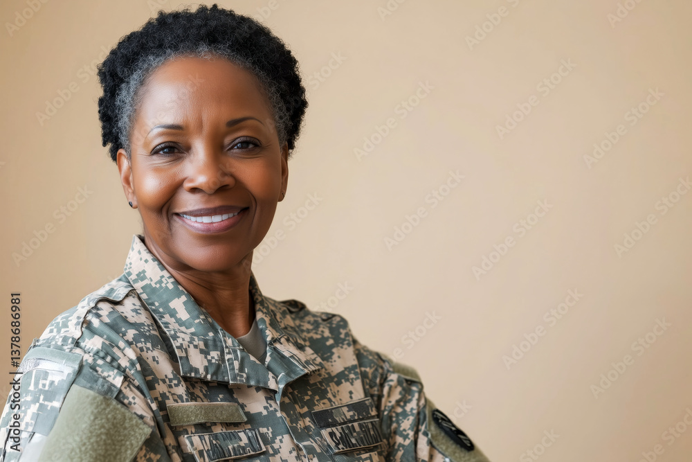 • Mature Black female veteran wearing uniform on beige background.