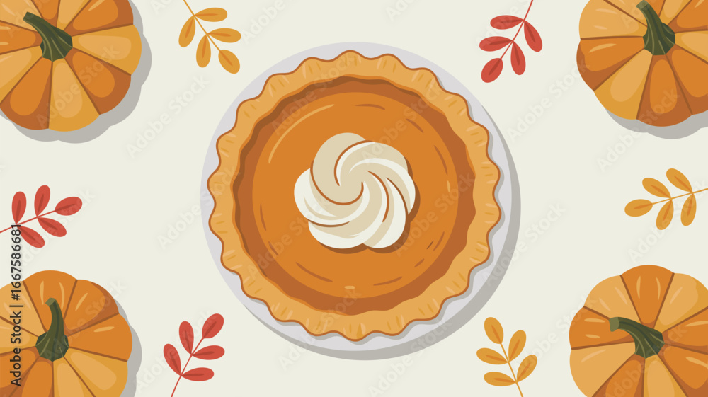 • Cartoon Pumpkin Pie with Whipped Cream, Pumpkins, and Autumn Leaves Background Illustration