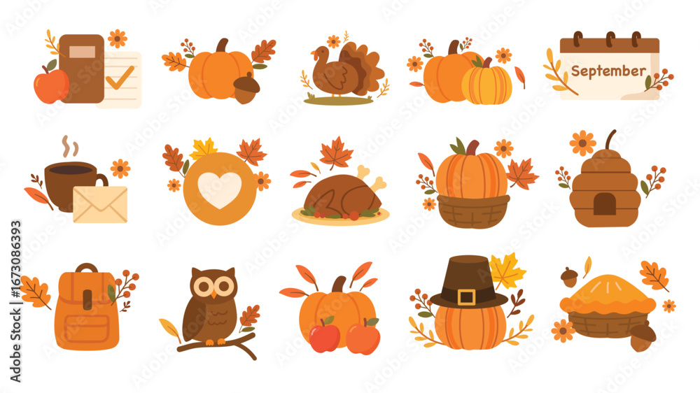 Obraz do Gabinetu Weterynaryjnego - Thanksgiving harvest set with turkey pie owl apples basket #1673086393