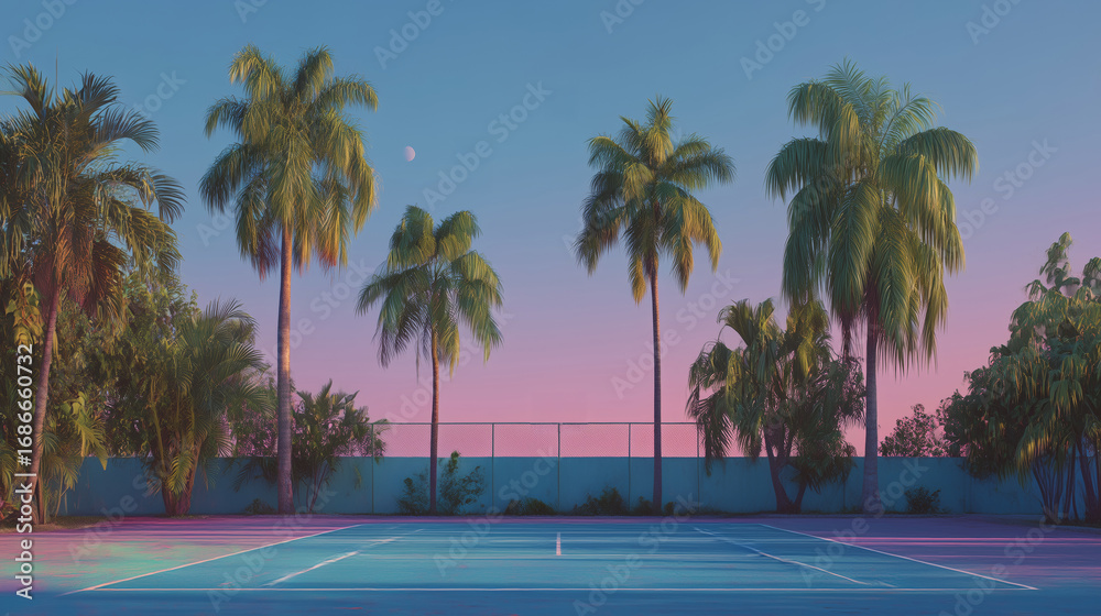 Obraz do Gabinetu Weterynaryjnego - Cancha de tenis rodeada de palmeras al atardecer paisaje tropical con tonos pastel, tenis... #1686660732