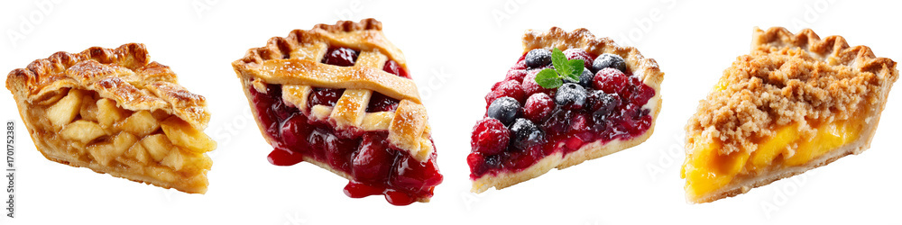 • Assorted fruit pie slices including apple cherry berry and peach on transparent background