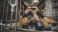 • German Shepherd dog patiently receiving IV drip treatment inside a veterinary clinic cage.