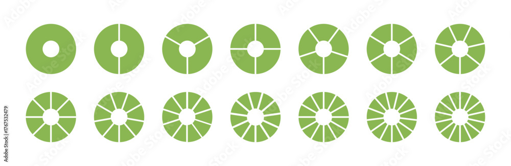 • Wheel life template. Circle division from 1 to 14 equal parts. Lifestyle balance. Green round divided diagrams segments. Infographics pizza, pie charts set. Coaching blanks pattern.