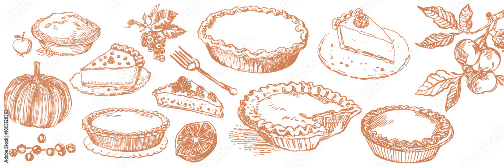 • Hand drawn Thanksgiving pies illustration set in vintage sketch style