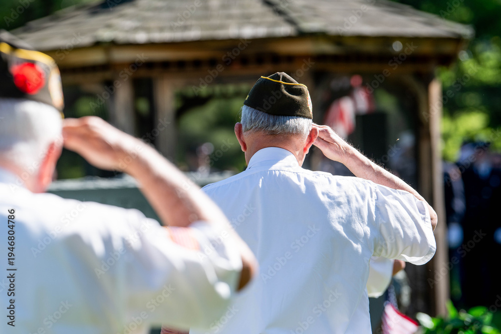 Obraz do Gabinetu Weterynaryjnego - US military veterans in garrison caps and white shirts salute the American flag at a memorial... #1946804786