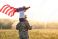 • Excited child sitting with american flag on shoulders of father reunited with family