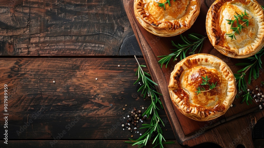 Obraz do Gabinetu Weterynaryjnego - Traditional Australian mini meat pie on wooden board close up top view with copy space in rustic... #907989959