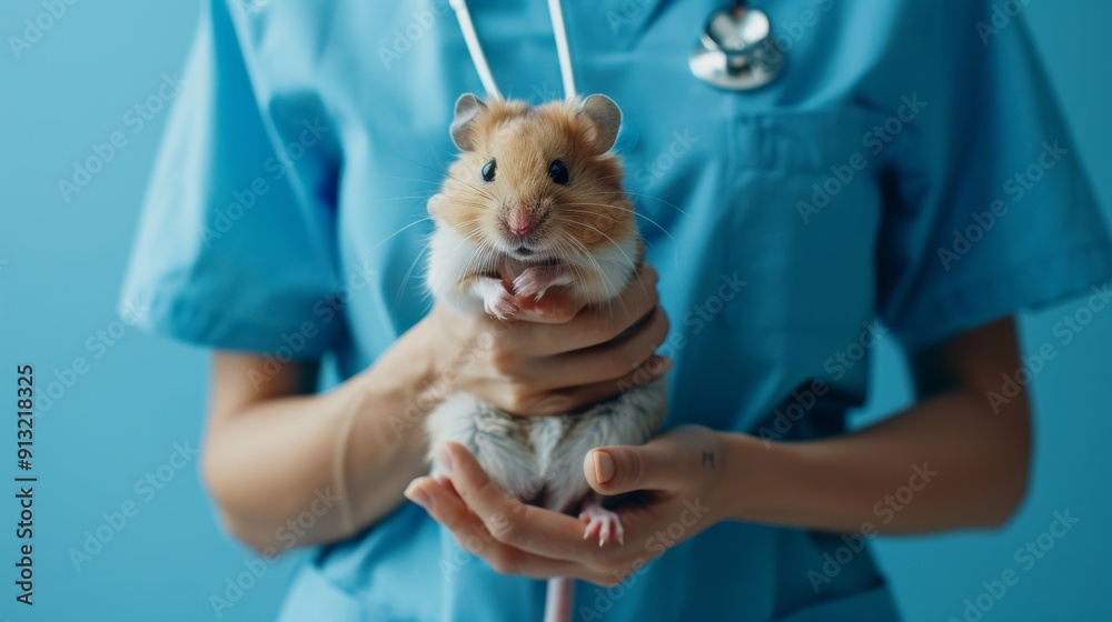 Obraz do Gabinetu Weterynaryjnego - Close up of vet holding hamster in light blue clinic, pet care and treatment concept banner #913218325