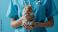 • Close up of vet holding hamster in light blue clinic, pet care and treatment concept banner