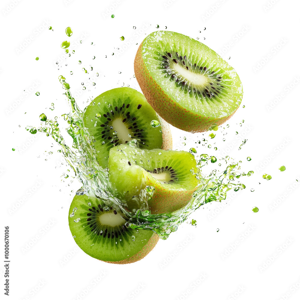 • Fresh kiwi slices with a splash of water, showcasing vibrant green colors and juicy texture, perfect for a refreshing fruit concept.