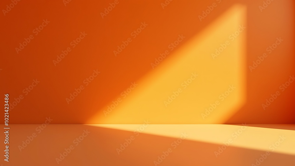• 3D studio room with orange background. Empty floor and wall with product podium. Shadow overlay from window to countertop. Mockup illustration with sunlight.