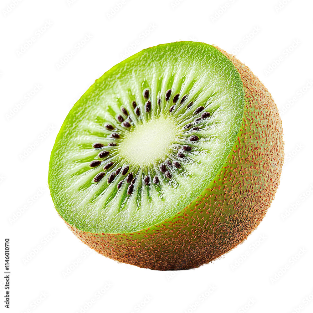 • Front view close-up of an extremely perfect looking single kiwi fruit cut in half isolated on a white transparent background