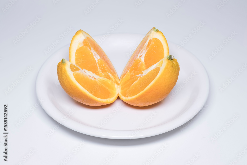 • Close-up of an orange cut into four pieces on a white plate and against a white background..