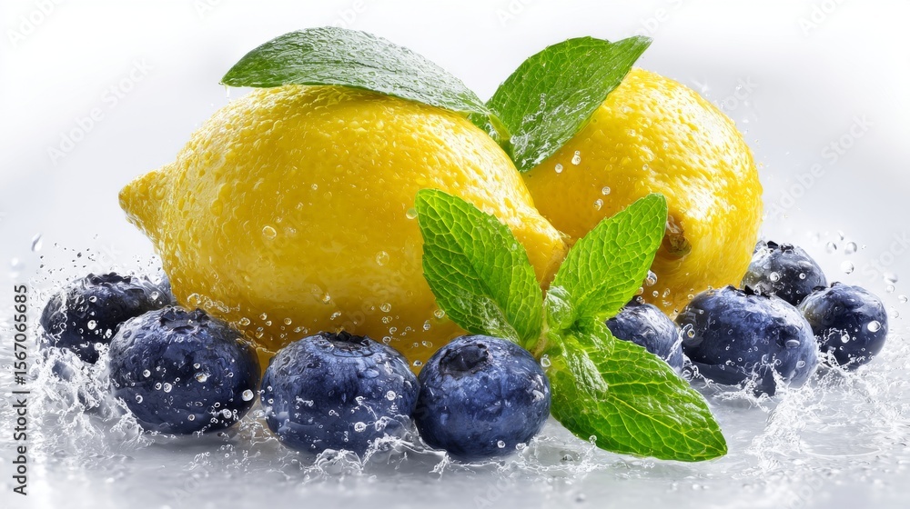 • On a white background, an assortment of fresh lemon slice, blueberries, mint leaves, and water splashes is artfully displayed