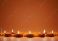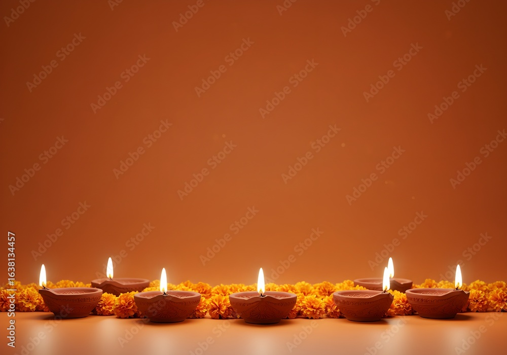• Row of Diya lamps with marigold flowers on orange background