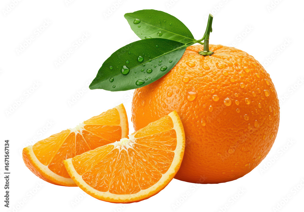 • Isolated Clementine orange fruit with leaves and two slices, fresh citrus with water droplets
