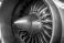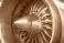 • Close up view of a jet engine with visible blades and a silver cone in a blue and orange hue