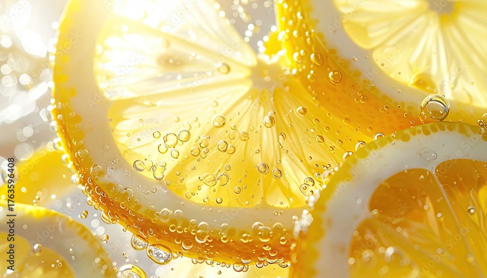 • Close up of bright yellow lemon slices submerged in clear water with sparkling bubbles and golden sunlight filtering through creating a refreshing and vibrant citrus abstract background