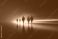 • Silhouettes of business people walking through illuminated corridor with glowing blue and orange light trails, representing teamwork, innovation, and the fast-moving pace of modern corporate life