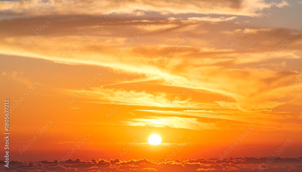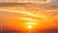 • Vivid orange and yellow sunset with fluffy clouds and a bright sun