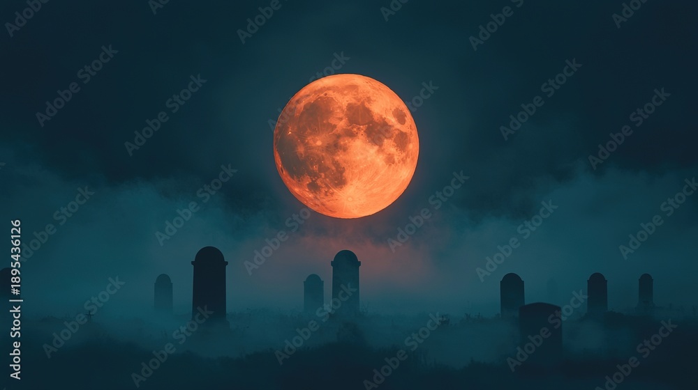 • A haunting graveyard scene illuminated by a large, glowing orange moon amidst swirling fog, creating an eerie atmosphere.