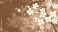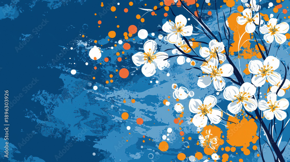 • Abstract floral design with white blossom flowers and orange splatter accents on a textured blue background creates a stylish and vibrant artistic composition.