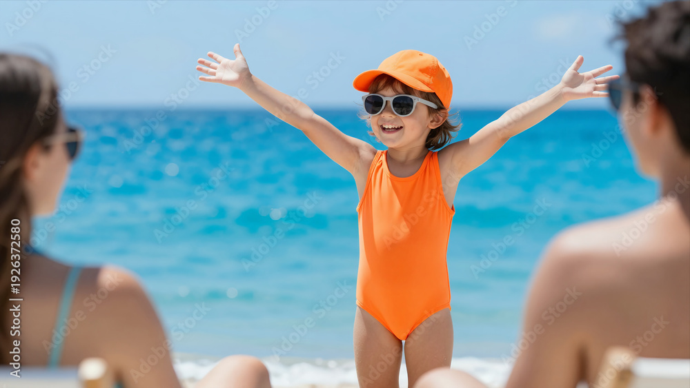 Obraz do Kuchni - Joyful Little Girl In Orange Swimwear Enjoying A Sunny Beach Day With Family In The Background #1926372580