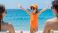 • Joyful Little Girl In Orange Swimwear Enjoying A Sunny Beach Day With Family In The Background