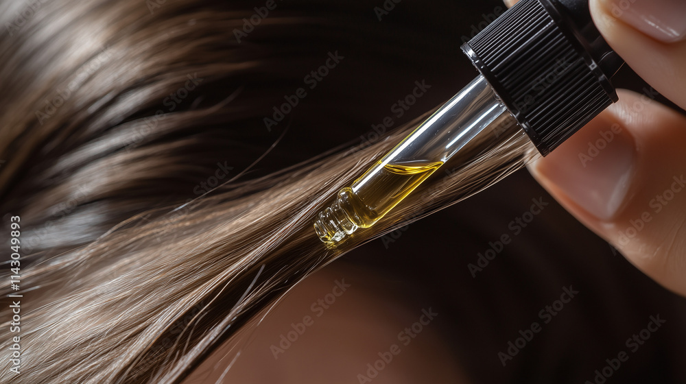 Obraz do Salonu Fryzjerskiego - Kobieta aplikuje olejek na włosy za pomocą pipety, pielęgnując i wzmacniając je w ramach domowej... #1143049893
