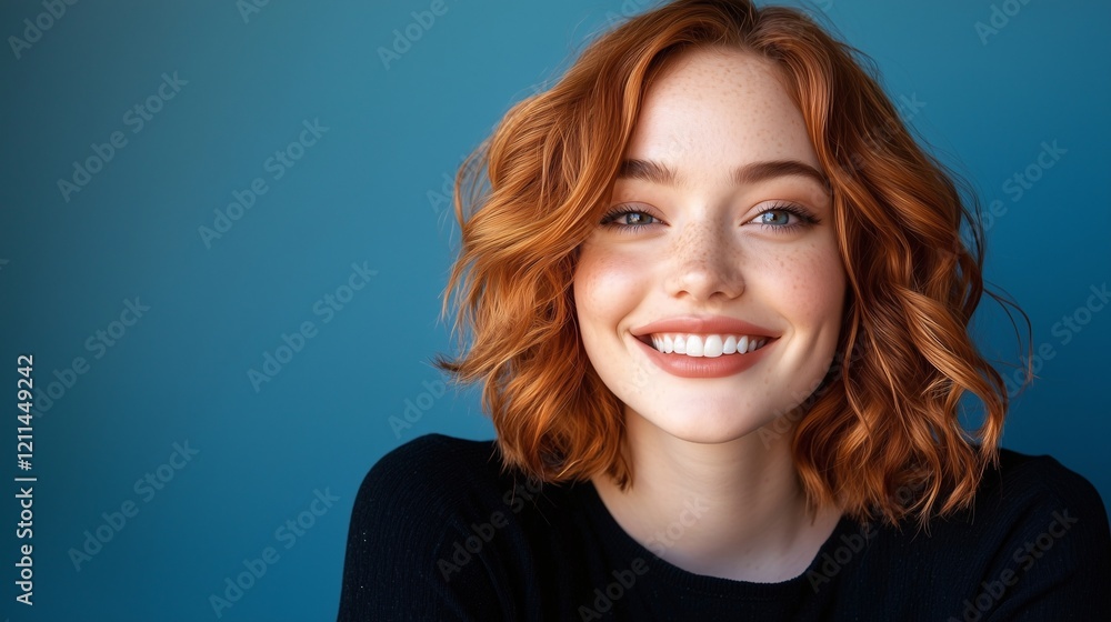 Obraz do Salonu Fryzjerskiego - Portret młodej kobiety z rudymi falami, szerokim uśmiechem i jasnym tłem, promienne piękno i... #1211449242