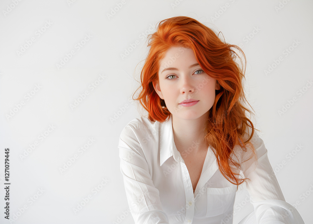 Obraz do Salonu Fryzjerskiego - Portret rudowłosej kobiety w białej koszuli na jasnym tle. #1271079445